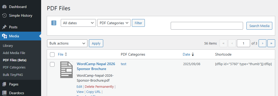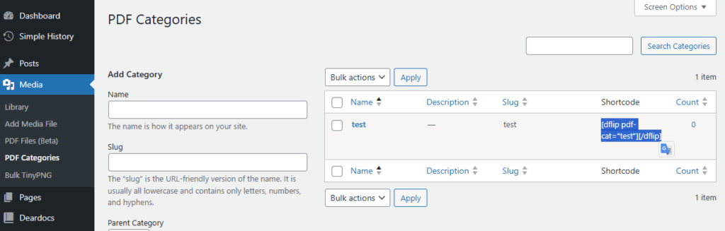 PDF files also has category support. Example shortcode: [dflip pdf-cat="test"][/dflip]