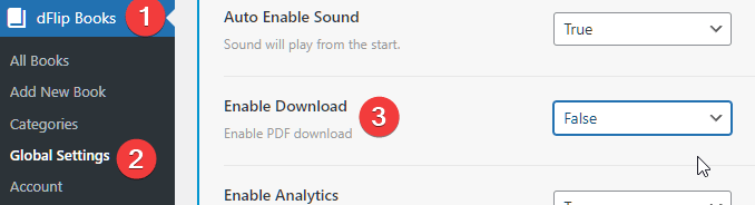 - Set it to False to hide Download for all flipbook in site. (It can be overridden by individual flipbook post setting)